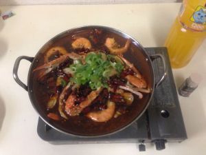 炒调料了。照片只来得及拍了这一张,所以我会把步骤讲清楚。 1)油7分热后,加入花椒,红辣椒,姜蒜爆香 2)加入青椒,大葱(如果有芹菜也在这时候加)一起炒 3)加入适量酱油,豆瓣酱,甜面酱(没有的话用糖代替)炒开 4)将之前的蔬菜,和虾一起倒入锅中炒开。加入半碗水,均匀炒开