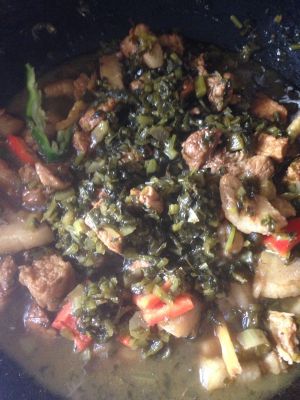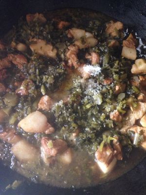 过节菜多忙,前面没拍,前夹肉连瘦带肥切小块,锅预热放油姜片爆香,下肉炒5分钟加酱油翻炒放适量水烧开焖15分钟,倒入雪菜。