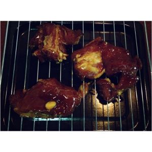 第二天将肉置于烤架上,下面要接烤盘,因为一边烤会一边滴油