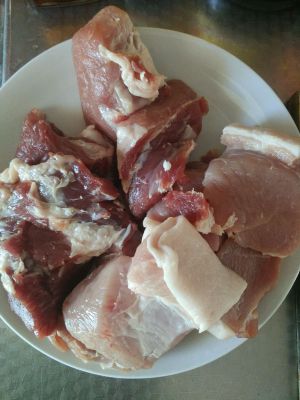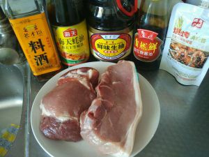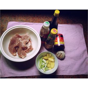 梅肉洗干净,用厨房纸吸干水,修成几小块。蒜头,姜切片,葱切断,所有材料准备齐全。(那一瓶矿泉水装的是农家正宗蜂蜜哦)