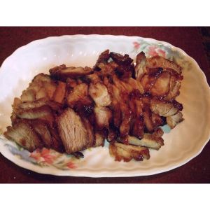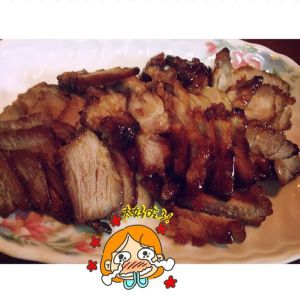 第二天把五花肉从冰箱里取出来,包上锡纸入烤箱220度,30分钟。拿出来打开锡纸倒出一部分汤汁,在肉上涂叉烧酱,再烤10分钟,取出翻面,用刚才倒出的汤汁加酱涂肉上,再烤10分钟,看肉的色彩程度,若不够可再翻面烤10分钟。