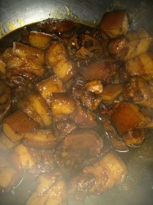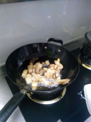 锅内少许油,放入葱姜八角编出香味,放入五花肉翻炒,加入适量水焖煮半个小时