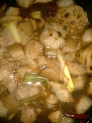 熬好糖色,放入肉,藕翻炒,放入葱姜大料,辣椒,酱油,料酒,盐,耗油,豆瓣酱,倒入水,开始大火,开锅小火,两小时左右。