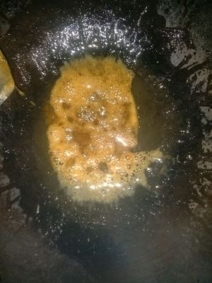 接着熬糖色、锅里放一点油,放冰糖熬比较好上色,