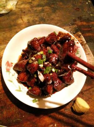 上色好了倒肉汤,肉汤没过五花肉,放生抽,桂皮八角,盐。盖好中火煮。还有二十分钟后改小火慢煮。快好时将剩下的葱放进去,出锅。