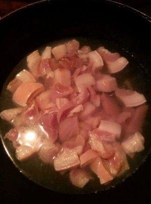 放一小丢丢油,将五花肉煸一下,等肉变金黄色捞起,用厨房用纸吸油。这样会让肉更香,也比较不会油。这步要小心,因为油会炸出来,我弄的时候全部武装了 肉油留起炒菜