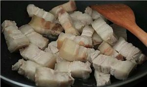 油锅爆香后倒入五花肉煸炒至有香味飘出。