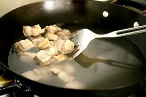 1、将五花肉切成块状,用水焯过放旁边备用。