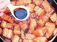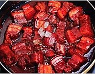将洗净的锅烧热,下油,放入冰糖,炒至红色,然后将肉放入锅中翻炒(小火,把肥肉的油炸出来一点,时间不宜过长,防止肉质较硬)