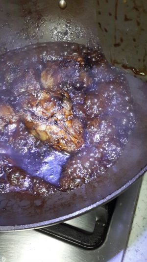 大概过了20分钟左右吧,可能更久,看个人情况,水烧掉一半了,可以加些醋和几勺糖,依旧中小火炖着,这个时候已经开始收汁了