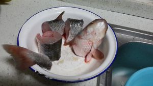 首先么,就是清洗哇!鱼里面黑黑的东西要洗掉哦!然后放在旁边沥干净水!或者拿厨房用纸擦!(什么鱼都可以啊鲫鱼非洲鱼,这是妈妈买的叫什么长江仔鱼!因为有点长,就切了下!一般一整条不用切的!)