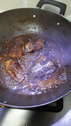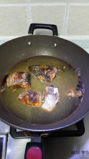 鱼有点大,倒3铲刀生抽(一般大的2铲刀左右),半铲刀老抽,然后加水,大概加到鱼的一半左右,然后开大火,等水开了之后转中小火,就让它先炖着