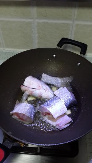 起油锅,放三四片生姜片,把鱼放进去煎到两面焦黄(要吸掉点水份再放油锅,不然油会爆出来),然后倒一些料酒