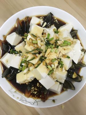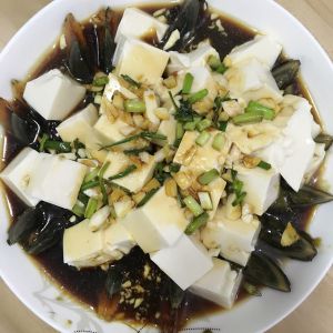 蒜和葱切成末放入空碗中,倒入酱油,香醋,白胡椒粉,香油,放入少量盐(可以稍微加点白糖),拌匀后微波炉热30秒,然后就淋到切好的皮蛋和豆腐上。