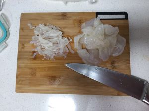 海蜇挤去水分,放盘里,黄瓜洗净切丝,切片,摆盘