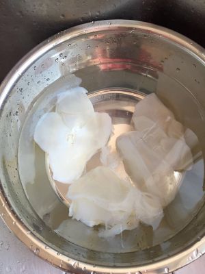 先将海蜇皮反复洗干净。然后泡在清水里,泡两小时。(因为买回来海蜇皮很咸,要把它咸味去掉。)