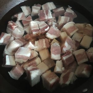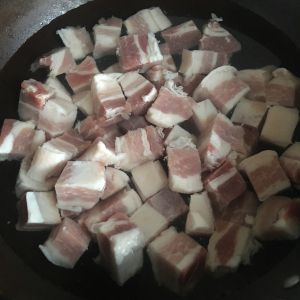 洗干净的肉块倒入平底锅,锅里不放油,中火慢慢炸出肉里的油,这样做出来才会不腻