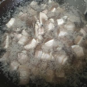 切好的五花肉冷水下锅,大火烧开,煮出血水,捞出后清水冲洗几次,洗干净上面的血沫。