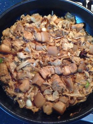 炙锅,加油,炒大料,姜片,下肉炒至固定颜色后,加水开始烧,下葱段,小火40分钟,后改大火待收汁晾油后即可。。