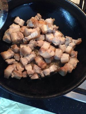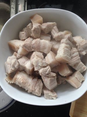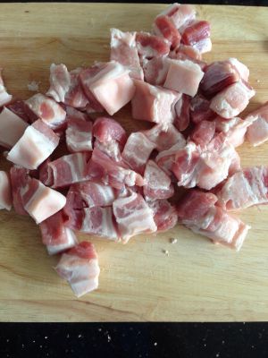 里外三层五花肉,切2-3厘米见方小块,洗净后放水中焯一下之后冷水过一遍,控干水分备用。
