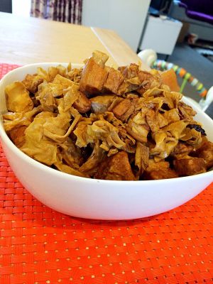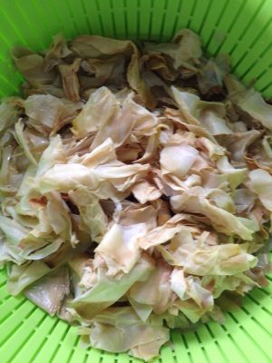 干笋衣头天晚上就泡上,泡软后一层层撕开继续泡,最后成这样一片片软软的,需要多清洗几遍,不然有渣子,吃的时候影响口感。