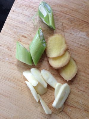 放入葱段、姜和蒜片儿,还有大料2-3个。
