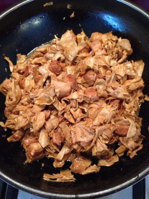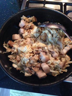 如果此时能有个砂锅就更棒了,把肉菜转入砂锅大火水开后盖上锅盖转小火炖1.5个小时,期间不时翻一下肉和笋衣,本人目前厨具有限,只能用炒锅或者炖锅。