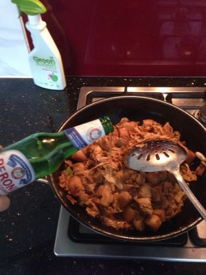 倒入啤酒刚好与肉和笋衣持平,啤酒炖肉的作用是去腥、去腻、提味儿,经过长时间炖烧酒精就挥发掉了,所以小朋友也可以放心吃!