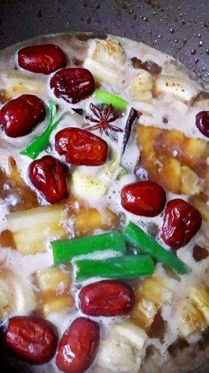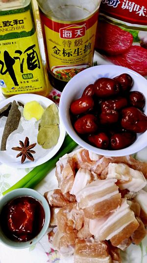 倒入白水,水没过五花肉,放入大葱、生姜、八角、桂皮、香叶、干枣、腐乳汁、生抽、大喜大牛肉粉,水使肉都浸在汤汁里,调入少许盐,盖上锅盖大火烧开,转至小火焖1个小时即可。