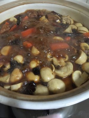 肉煮二十分钟以后下锅爆炒,炒到肉肉有一点焦的时候下八角花椒辣椒,炒香以后放白砂糖老抽上色,生抽调味,上好色以后转入砂锅,炖十五分钟,放胡萝卜和口蘑,继续炖半个小时