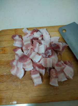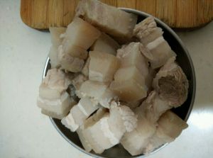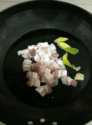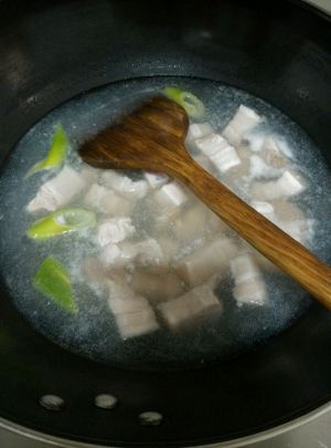 五花肉切好,洗干净,然后用清水煮一下、把肉捞出来用水把沫子洗净,再控下水!