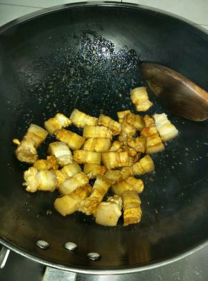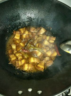 炒大概3分钟,看瘦肉快熟了,放适量酱油调味,红烧少不了酱油,酱油还可以解腻哦!