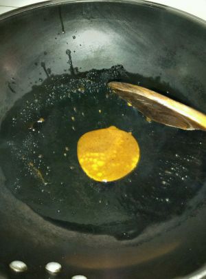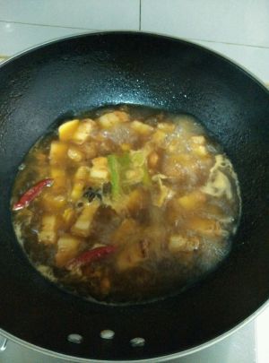 油烧热一点点的时候把糖放入锅内,用勺子不停的搅拌,熬到褐色的时候把肉到锅里、然后把料酒、八角、切好的葱姜、盐、味精、酱油、都到入锅内一起翻炒!都沾到颜色后到入水、再把鸡蛋拨好皮用刀切几道!也放到锅内!
