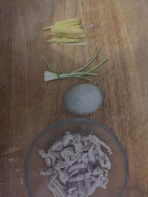 准备材料:皮蛋、姜丝、肉丝、葱花