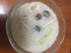 粥好后,将皮蛋和瘦肉放入,放入葱姜蒜,继续文火熬煮。
