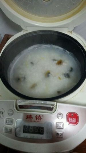 2,再熬十分钟后加入盐,皮蛋,瘦肉,熬个五分钟。