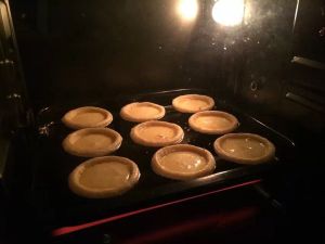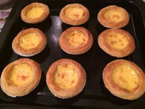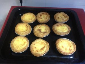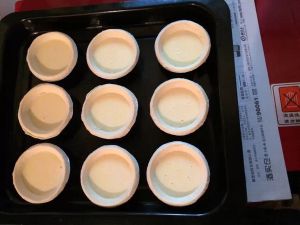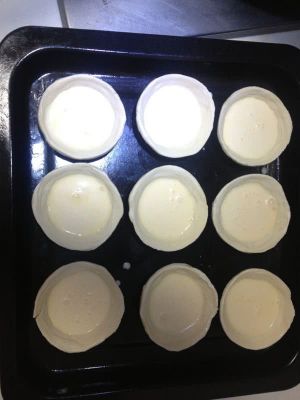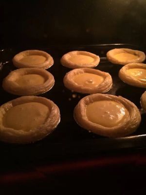 蛋挞液倒入蛋挞皮中,放入烤盘上,烤箱上下火,中层,210,25分钟