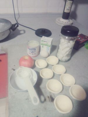 用勺子舀入其中,最后就是放苹果了,所以随意啦,一定到8成满就好,不然就会溢出来!!放入烤箱(已预热),200度20分钟