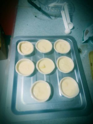 再将小锅中的混合液倒入蛋挞皮中,八分满即可,注意蛋挞皮提早从速冻里拿出来解冻