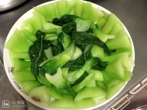 油菜摆盘,根部朝外,叶子摆在中间,呈花状;