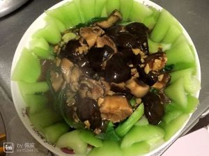 油热爆香蒜末,倒入香菇翻炒,加老抽、生抽、耗油、糖、盐~