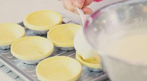 把搅拌好的蛋挞液倒入蛋挞皮内