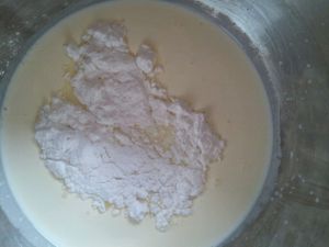 一边搅拌一边加入蛋黄液~搅拌均匀