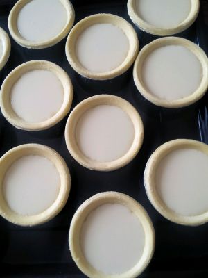 准备好蛋挞皮,整齐的排在烤箱盘中!将搅拌好的材料用勺子装入蛋挞皮内,不要太满哦!