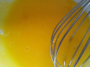 拿3只鸡蛋,取出蛋黄加入到之前做好的奶液中并搅拌均匀,这样蛋挞液就做好了