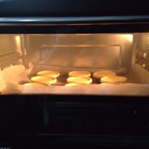 在烤盘上铺上硅油纸,把蛋挞挨个放入,注意摆放均匀,烤箱上下烤220预热10分钟,蛋挞进烤箱烤15分钟左右