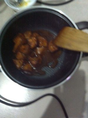 把锅放入少量水,也就多半勺子吧,然后放糖,中火熬到发黄起泡,倒入地瓜,翻炒两下出锅