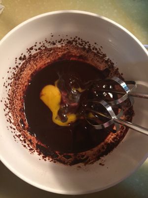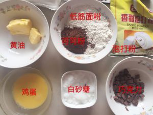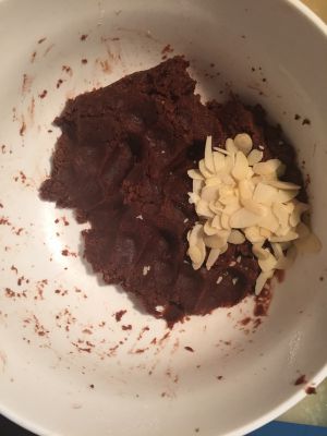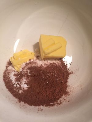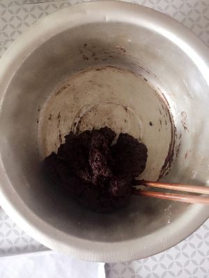 将面粉,可可粉,泡打粉过筛加入黄油液中,充分搅拌至黄油与粉状充分融合在一起。