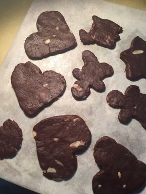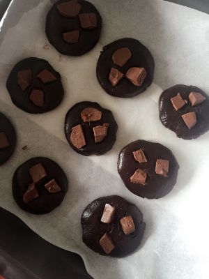 巧克力切成小块,将巧克力按压在曲奇上,每块曲奇上有三到四块即可。将烤盘放入预热过的烤箱中层,温度是上下火170度,我的烤箱小所以温度比较高,烤制十五分钟左右,出炉后彻底冷却等巧克力凝固后就可以食用啦。
