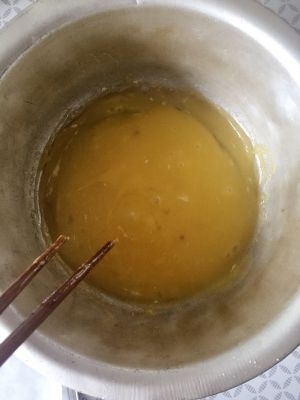 一点点加入鸡蛋液,用打蛋器搅拌至柔滑